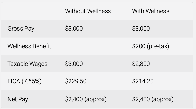 See how a wellness benefit appears on a real paycheck: the employee’s net pay is unchanged, but the employer pays less in payroll taxes.